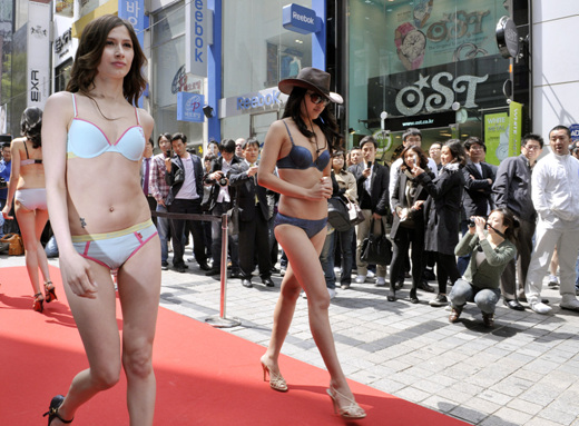 FeetmanSeoul argues that this accounts for Korean models’ virtual disguises(!) at Levi’s “Best Body” fashion show in Myeongdong last week (source, right), although it may well have been the choice of organizers rather than the models themselves.