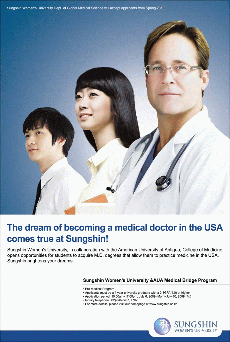 After just a few minutes thought though, obvious reasons emerge for all of those: men are and should be featured because the program is available to both men and women (well technically, the website doesn’t mention anything about the sex of applicants) for instance, and for all their ethnic diversity Caucasians are still an instant and logical signifier of Western countries. And dealing face to face with an American colleague at an American hospital – ie, having a job at one – is precisely the goal of students that will enter this program too, which in turn is well represented by the Koreans in the advertisement looking towards their futures as it were. As the male Korean is wearing a tie, then I’m a bit unsure as to whether the Koreans are supposed to be students in the program or graduates with jobs looking for better opportunities, but other than that slight confusion then the advertisement appears logical as a whole.