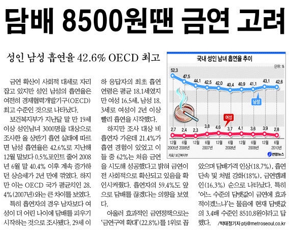 According to a survey of 3000 men and women over the age of 19 conducted by the Ministry of Health and Welfare last month, 42.6% of Korean men smoked in the first half of this year, a decrease of 0.5% from the second half of last year, and a break in continuous increases for the past 2 years from August 2008, when it was 40.4%. However, a large gap between this and the average OECD rate of 28.4% (2007) is apparent.