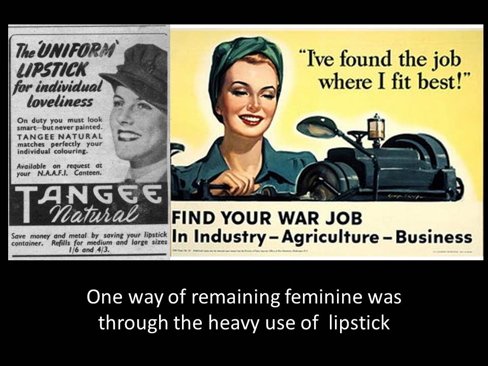 Women adapted their appearance to the wartime look, which deemphasized physical differences between the sexes, but they did not completely abandon adornments symbolizing femininity. While some adjusted to the disappearance of silk and nylon by going barelegged, others used leg makeup and some even painted on a seam line. Women emphasized their lips by favoring dark colors. The focus on breasts did not peak until later, but the sweatergirl look, popularized by Lana Turner and other movie stars, had its origins in the war years, and women competed in Sweater Girl contests as early as 1943.