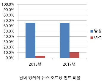 먼저 뉴스 프로그램 앵커의 경우 오프닝 멘트와 그 날 가장 중요한 기사인 첫 다섯 꼭지를 남성 앵커가 소화하는 비율은 2015년과 2017년 모두 60%를 넘었다.