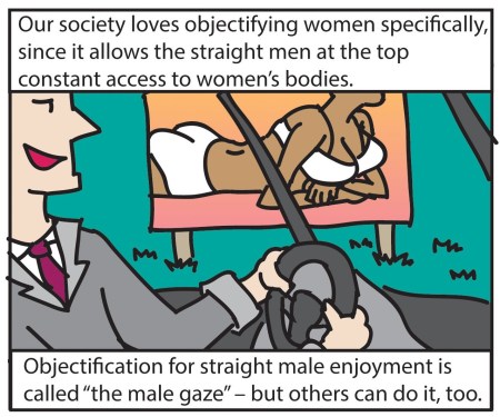 Or take the panel above from M.Slade‘s cartoon in Everyday Feminism entitled “Am I a Queer Woman Looking Through the Male Gaze?”. Again, I think it’s the Male Gaze, but it’s much more unclear this time.