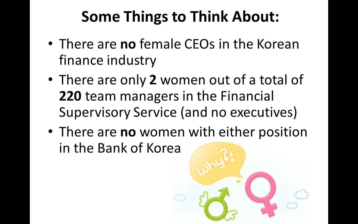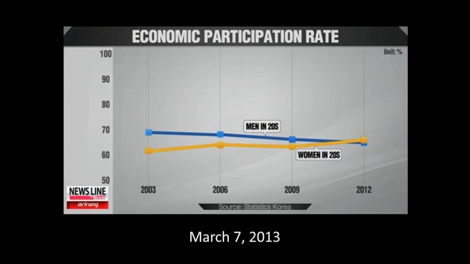 Turnbull believes it is a term deliberately employed to cause agitation—the disparity in male and female employment rates is actually only 2.1%. However, the male groups of society have reacted swiftly and with mortal urgency in a massive backlash. Some men’s rights organizations have even called for the abolition of the Ministry of Gender Equality and Family. In fact, according to a World Economic Forum 2015 report on Global Gender Inequality, South Korea still ranks 115th out of 145 countries. In the “economic participation and opportunities” categories, South Korea is 125th.