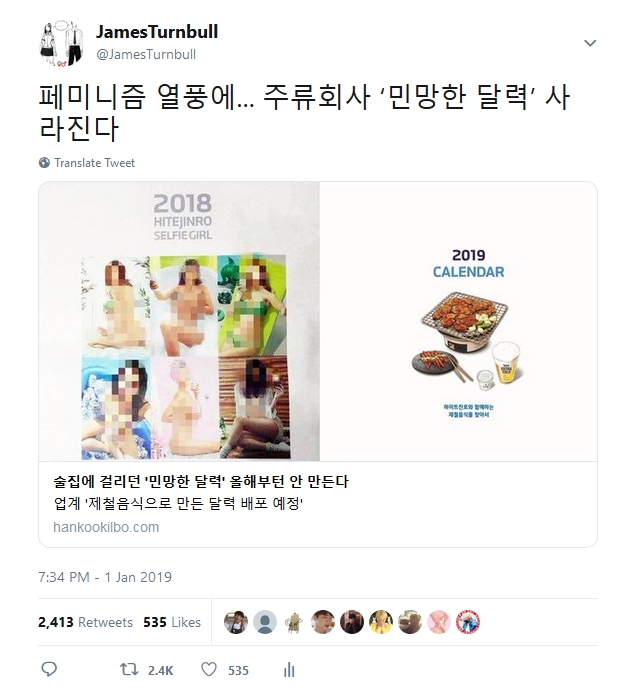 Besides blogging, he also holds down a full-time job at Busan’s Dongseo University. He spends so much of his spare time and energy maintaining and updating his blog, it’s almost a kind of volunteer work at this point. Over time, his blog has gained the approval of the mainstream—[most recently, he was quoted for several stories for CNN in 2018]—and Turnbull became something of an authority on Korean feminism and pop culture in Western media. Occasionally, he has even been invited to give guest lectures at Seoul National University and other higher education institutions.