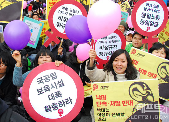 Not so much because Koreans feel strongly about abortion itself though. Rather, because this is the same president that immediately tried to abolish the (then) Ministry of Gender Equality for instance, despite campaign promises not to. And also, because a year later, he encouraged targeting women for mass layoffs as a solution to the financial crisis. Criminalizing abortion simply in order to increase the birthrate rate then, is really part and parcel of a wider mentality that is fundamentally failing to get to grips with women’s entrenched inequality here. And perhaps could come be the symbol and/or catalyst for later volatile protests about any number of related issues, much like those in 2008 were never really simply about imported beef.