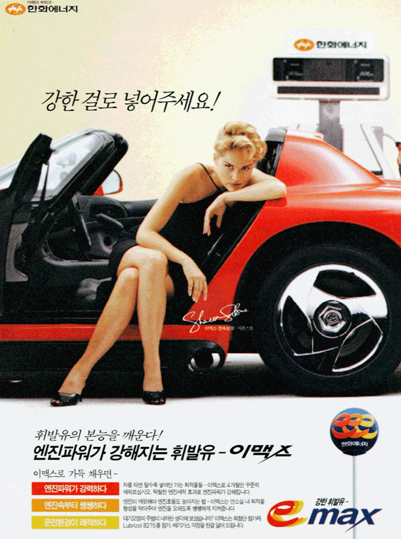 For example, last year [2005], Bae Doo-na and Shin Ha-kyun appeared in an advertisement for a wireless internet company which included the line “Because [we] do [it] outside, [it’s] much more exciting!,” which generated a lot of complaints. Also, in the early 1990s, an advertisement for an ice cream company featured a female drill instructor saying to a new male recruit “I gave [it] to you to eat, but you can’t eat it [well]!,” and finally in the late-1990s a gasoline advertisement featuring Sharon Stone climbing into a red sports car had her saying “only put strong [things] inside.” (James: See below for the latter two).