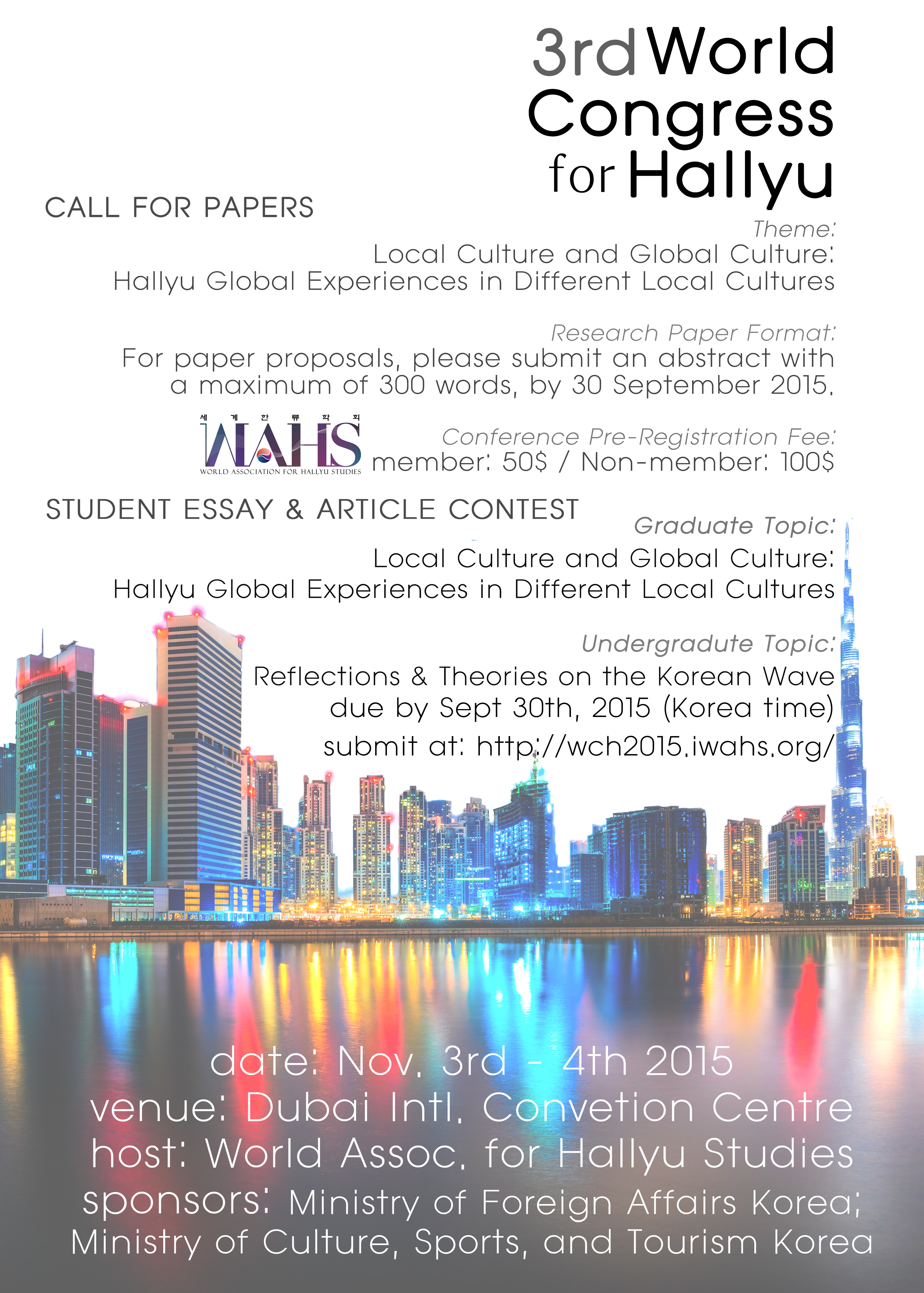 …I am emailing on behalf of WAHS to inform you of an upcoming international conference in Dubai on Hallyu Studies. The conference, World Congress on Hallyu, is the third of its kind and aims to bring together academics, students, and organizations who have an interest in the phenomenon of the Korean wave, known as Hallyu. Currently, we have branches of research in the Middle East, Southeast Asia, North America, and Europe.
