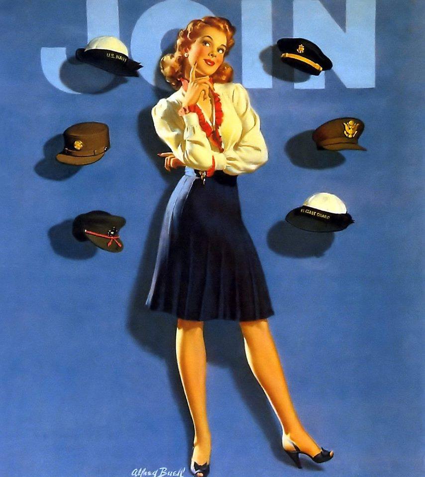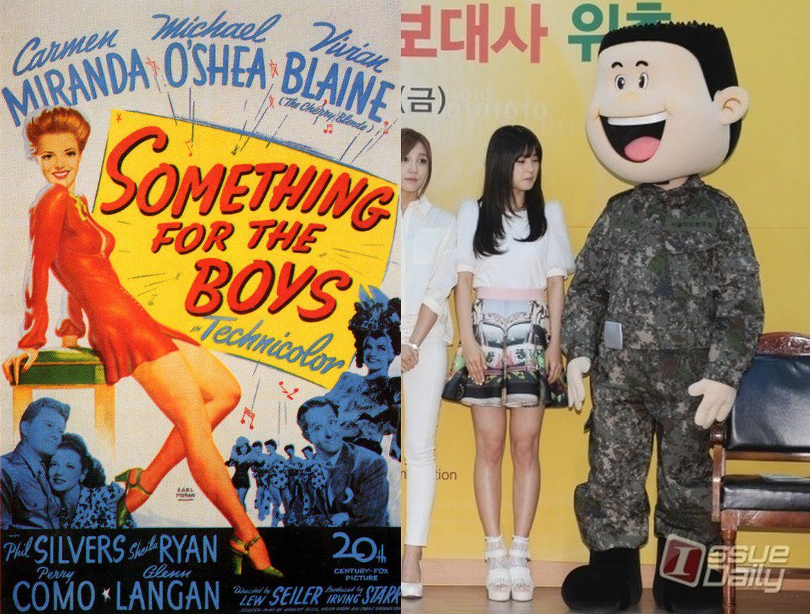 Not realizing that appointments like theirs actually had a long precedent as I’ll explain, my first thought was to compare their recruitment posters to some of their (Allied) World War Two equivalents. I expected that most that featured women would present sexual access to them as a motivation for fighting (PDF download) and/or the denial of that access to the rapacious enemy. But to my surprise, most of the posters with women were actually for women, with the purpose of recruiting them for ancillary organizations and factory work. Borrowing “the seductiveness, sass, and self-assurance” of pin-up girls, Maria Elena Buszek explains in Pin-Up Grrrls: Feminism, Sexuality, Popular Culture(2006), they reminded women of their choices among active, formerly “masculine” paths in the public sphere, “in what must have felt like an abundance of subversive opportunities.” And the contrast with Apink’s roles in the MMA’s campaign for men was striking.