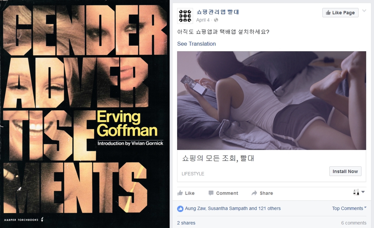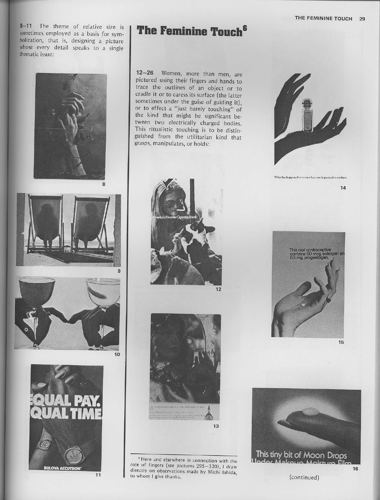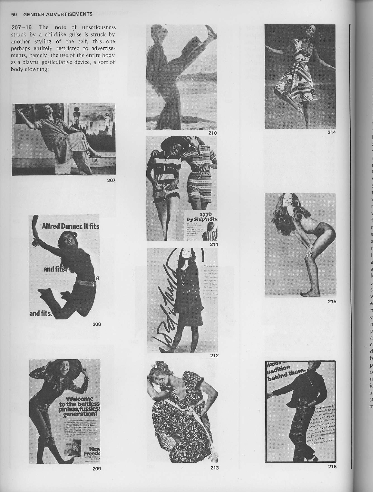 Because in addition to the aforementioned gender imbalance (which is the real issue; there’s absolutely nothing wrong with being cute), let me leave you with two pages from the classic Gender Advertisements by sociologist Erving Goffman, first produced the same year as me—1976. Sometimes, as you’ll see, it’s astounding to realize how little has changed in the 46 years since then.