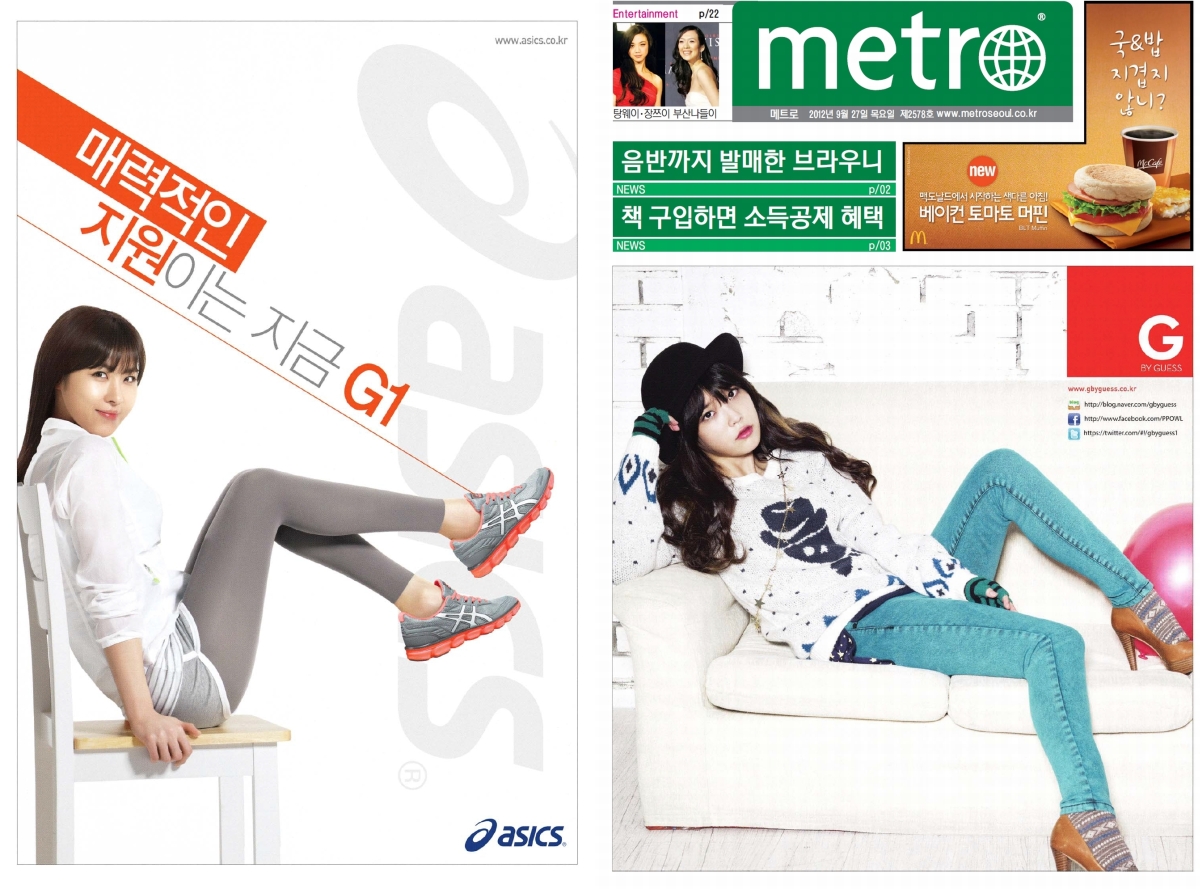 Left: Victoria Song of f(x) showing off her ‘S-line’ in 2009 (Source unknown). Right: Eun-ha of GFriend in 2016; middle caption says “The ‘Tulip Line’ skirt that will immediately capture men’s hearts” (Source: MLBPARK).