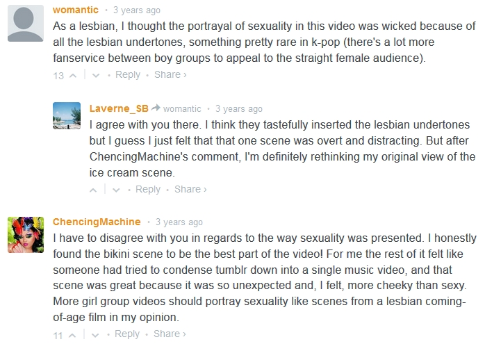 That is to say, the Korean media made that last claim, which is never shy of putting the concerns of ajosshi/samcheon fans front and center; click on the GIF above to see what (generally quite knowledgeable) Omona! They Didn’t! commenters thought of all that, and for more examples of the Lolitaesque subtext to Apink’s repeated claims of innocence. I’ll return to those in later posts, as I will the third elephant of the herd: that, all that time, the Apink members may have just been parroting the lines provided to them by Cube Entertainment, as indeed they may have been later when they started expressing their frustrations with their continued infantilization—an issue at the heart of how we judge K-pop, yet something that we usually just don’t know.