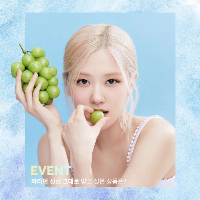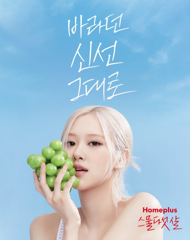 Just see for yourself. Compare this first of two additional images Homeplus released on its Instagram on July 15, but neither of which seem to be displayed in stores. (Yes, I’ve visited four in the last two weeks to check, feverishly snapping away at Rosé; by now, the security staff have probably flagged me as a pervertedsamcheon fan.) This one isn’t perfect by any means, but it at least retains some of the sensuality of the commercial, by reminding consumers that delicious-looking grapes are best enjoyed by actually eating them. And again, even if making a link to her youthful skin was considered just as or even more important (because Korea), why not combine both motifs?