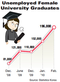 Not only has youth unemployment reached a 10-year high of 10% and is still rising, but the number of jobless female graduates has hit a record high, and the JoongAng Ilbo has a report on the structural and discriminatory practices responsible. Not that it gladdens me to be proved right, but this was somewhat predictable considering the fact that women were overwhelmingly targeted for recession in the financial crisis, as I reported in my very first Korean Gender Reader post in January 2009 (source right: Korea Times).