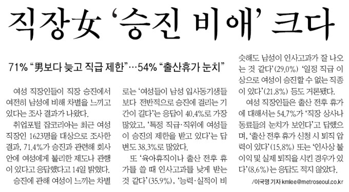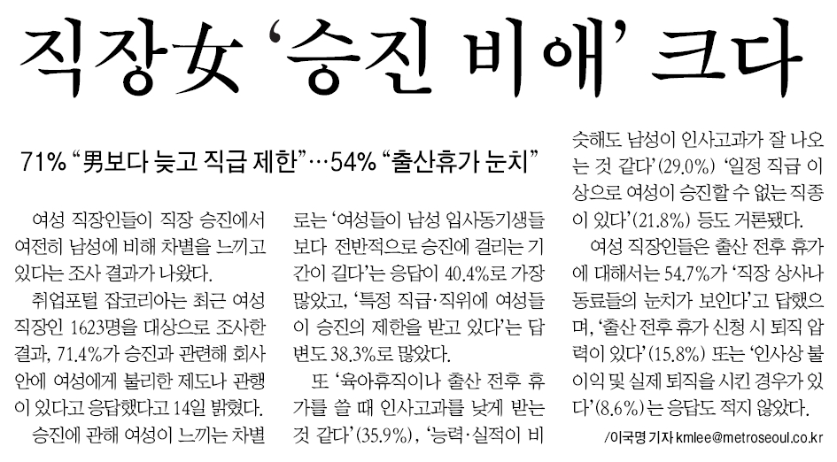 The results of a survey of 1623 women workers by job portal site JobKorea, released on the 14th, showed that 71.4% believed that the promotion systems at their companies placed women at a disadvantage.