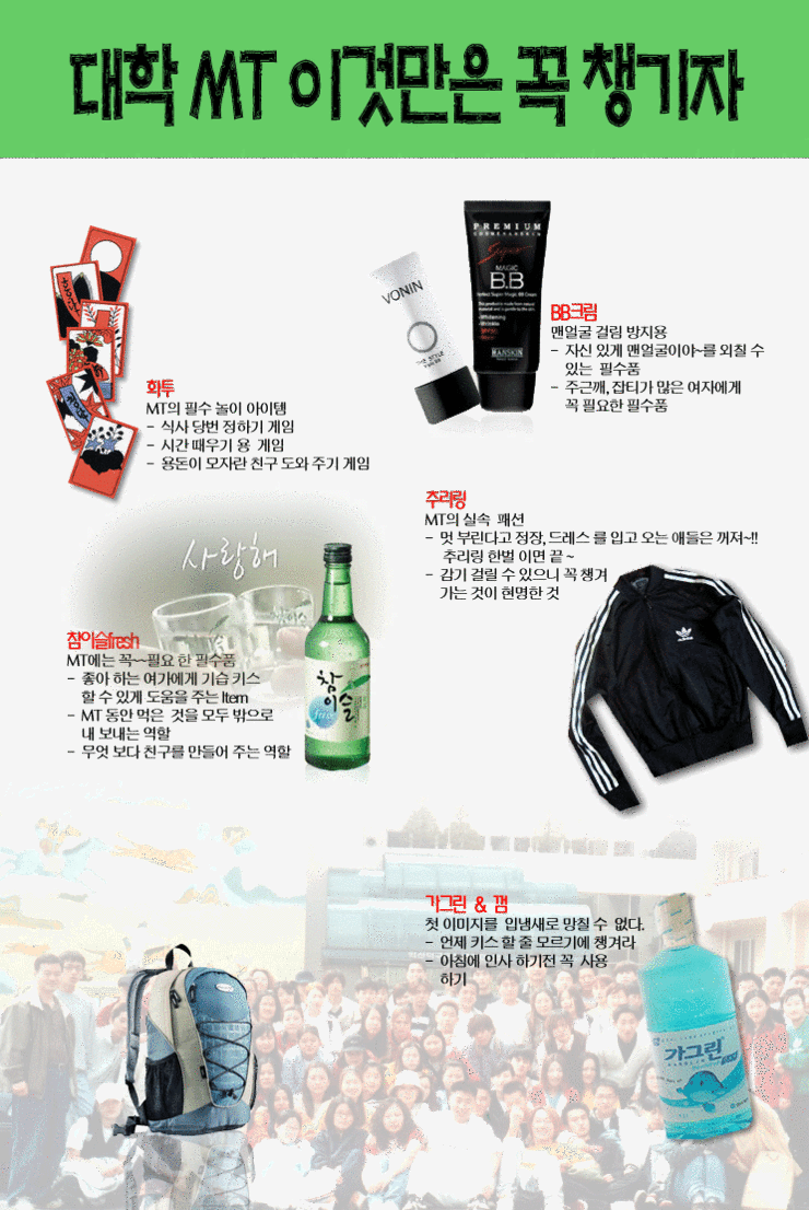 A disclaimer: I’ve never attended MT or even talked about it with students, so, students’ normal proclivities aside, I’m sure many or even most events are perfectly fine, and indeed Joe SeoulMan – ironically the source of one of the above images – has an account of a very nice, almost heartwarming one here. On the other hand, Extra! Korea argues that “it’s well-known among Koreans that sexual harassment is widespread at MTs”, and there’s certainly enough news stories in the Korean media to back that up.