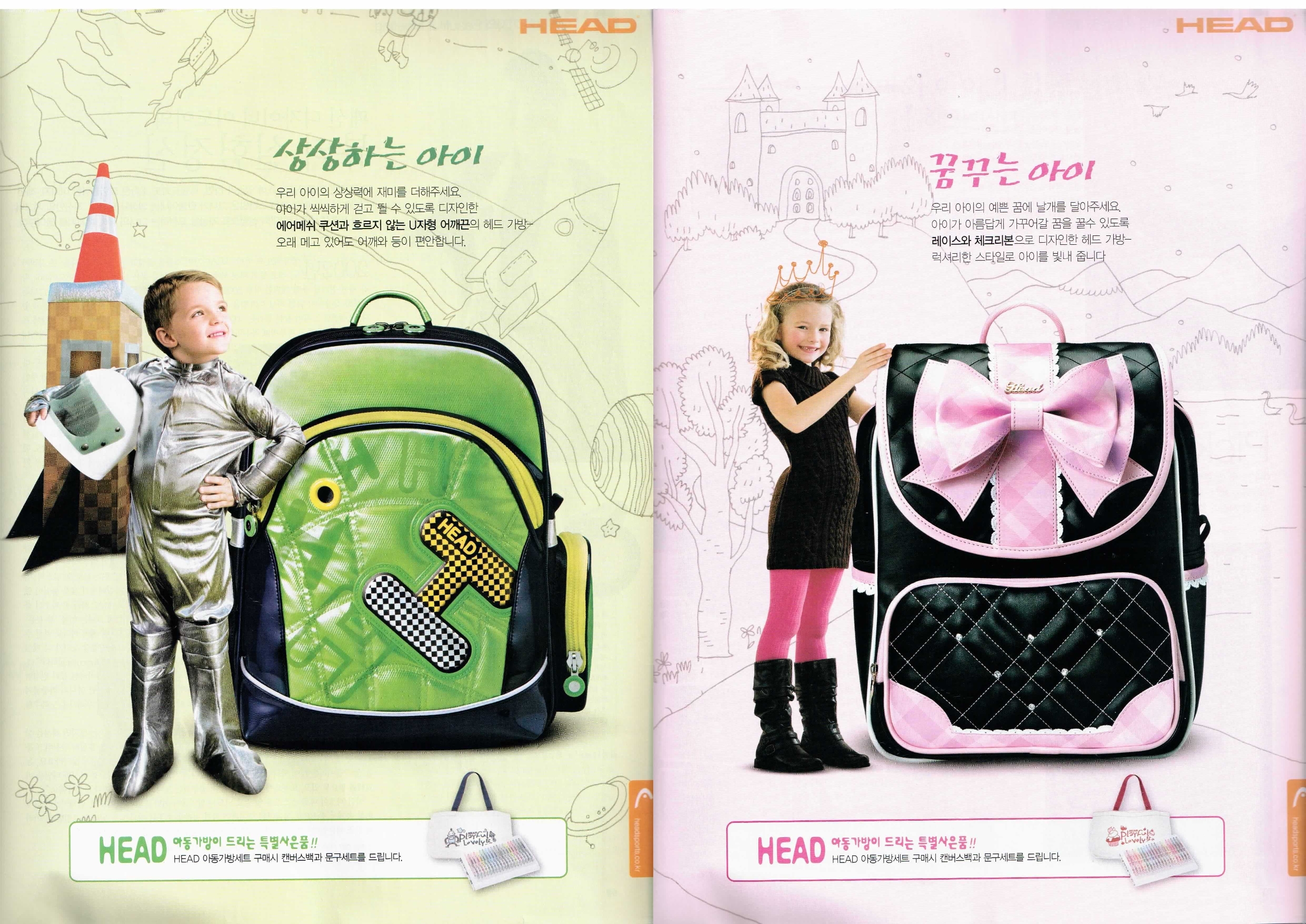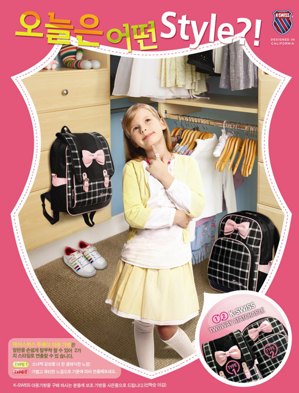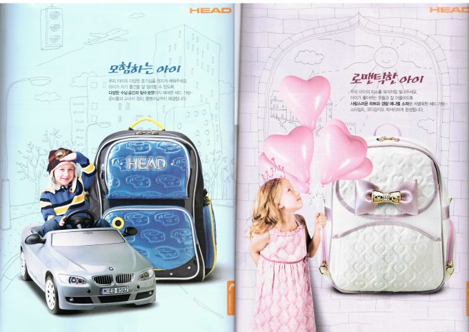 Unfortunately, the magazine was no longer available, but as you can see above I did manage to find at least the 2 K-SWISS (케이스위스) ones online later (the other 4 were from HEAD {헤드}). Paraphrasing just a little, the Korean on the girl’s ad reads “What style shall I choose today?!”, while that on the boy’s reads “Through [this bag’s] strength/firmness and lightness, achieve children’s dreams!”. Sigh.