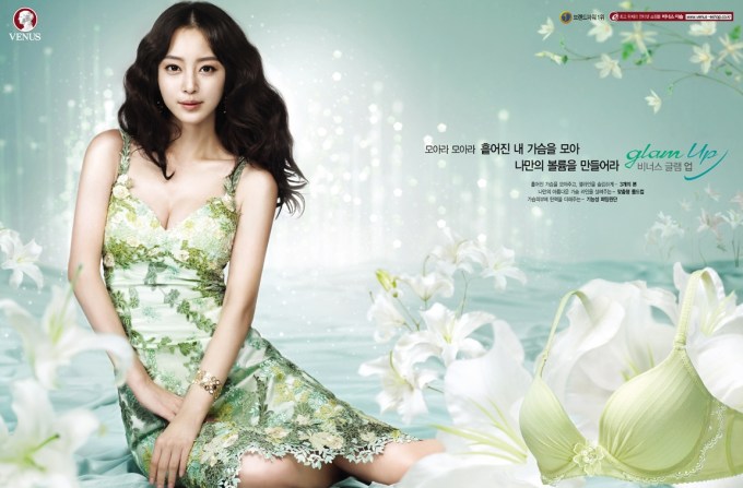 Next is this one for Venus lingerie (비너스) featuring Han Ye-seul (한예슬), featured on the front page of Korea’s main portal site Naver (네이버) as I type this. Why it’s interesting is because of the English name “Glam Up” for the bra featured, which, making little sense otherwise, supports the argument that the English word “glamor” has somehow come to mean “voluptuous” or “curvaceous” in Korean: