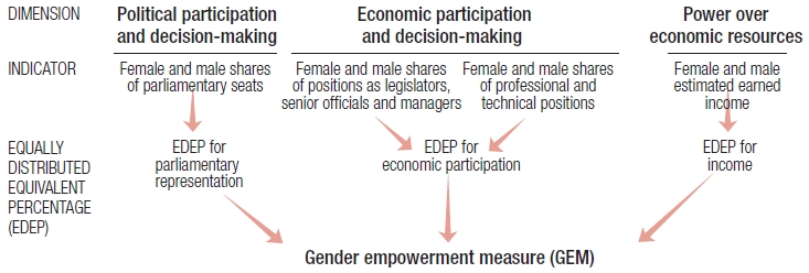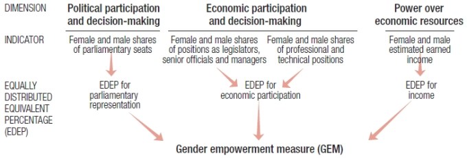 …an indicator of women’s degree of participation in political and economic activity and the policy-making process, using for its evaluation factors such as the number of female legislators, the percentage of women in senior official and managerial positions, the percentage of women in professional and technical positions, and the income differential between men and women (source).